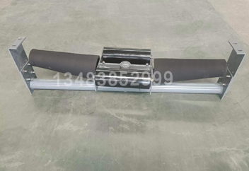 雙中輥調(diào)偏托輥組回轉(zhuǎn)軸焊在下橫梁上,回轉(zhuǎn)總成(包括組合軸承、回轉(zhuǎn)軸套)安裝在下橫梁上方,回轉(zhuǎn)總成外圍設(shè)計(jì)了可擺動的中托輥橫梁,以回轉(zhuǎn)軸為中心,在運(yùn)行膠帶前、后中托輥橫梁上各設(shè)置一個(gè)中托輥,形成以回轉(zhuǎn)軸為中心的平衡支撐。側(cè)托輥采用加大軸承和軸徑設(shè)計(jì),用側(cè)托輥軸代替常規(guī)的側(cè)托輥橫梁功能。側(cè)托輥可拆卸的安裝在兩中輥中間。側(cè)托輥為錐形輥設(shè)計(jì),錐形輥采用鑄橡膠結(jié)構(gòu),其在膠帶跑偏時(shí)能產(chǎn)生較大的回向阻尼效果,從而使膠帶居中平穩(wěn)運(yùn)行。